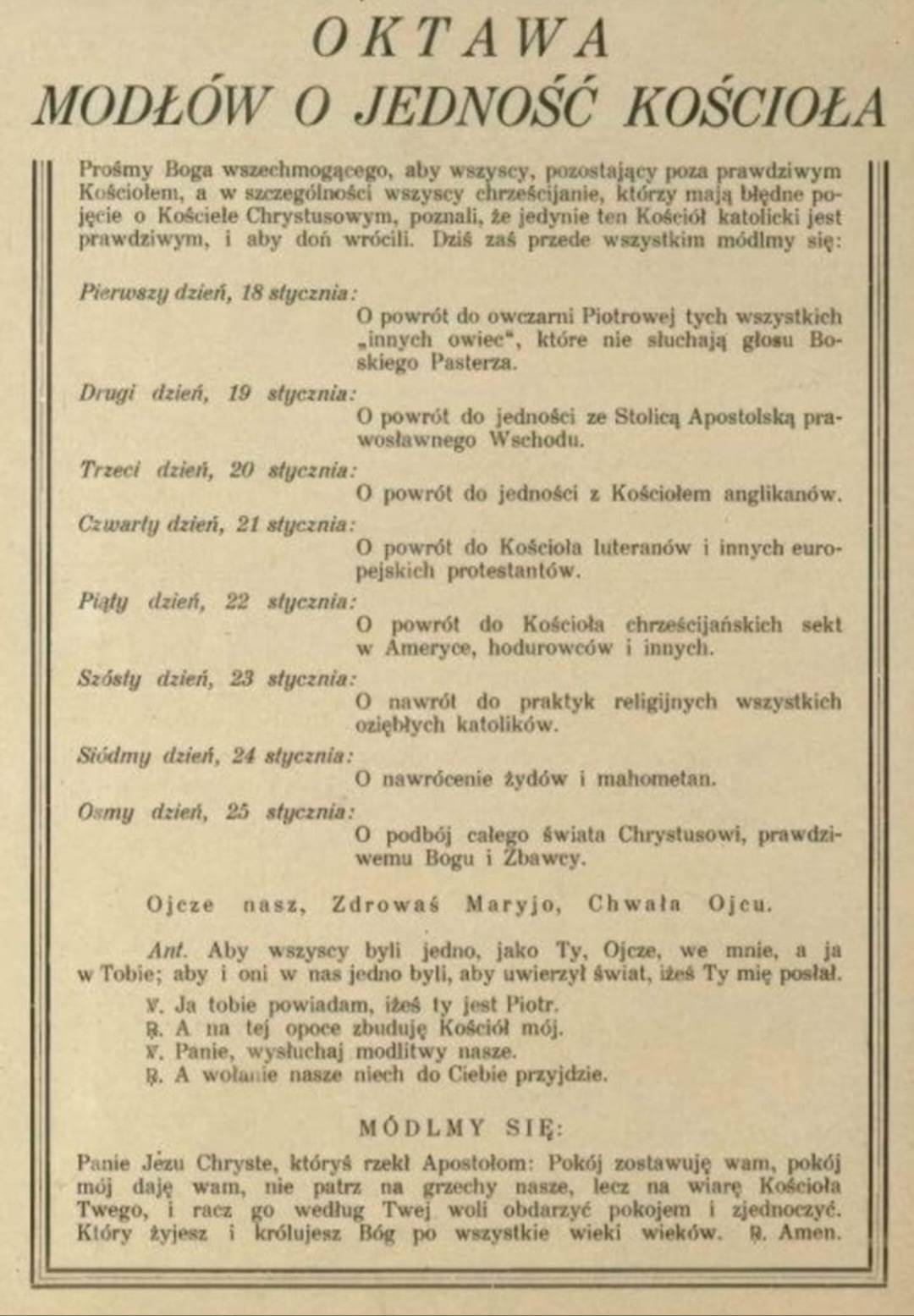 W dniach 18-25 stycznia będzie odmawiana tradycyjna nowenna w intencji jedności Kościoła (w w niedziele po Mszy św. o 8.00, a w dni robocze wieczorem po różańcu). Tekst nowenny jest dostępny w załączniku elektronicznym – zachęcamy do udziału w tej modlitwie.